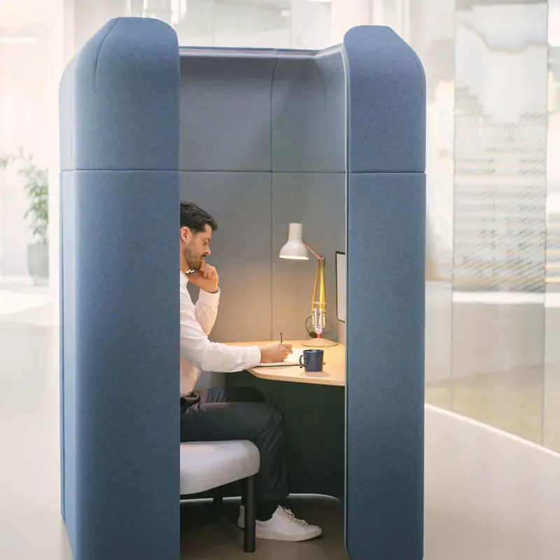 That might mean a quieter lounge seat for heads-down work. A semi-enclosed setting for concentration or informal exchange. A work café that encourages natural interaction without forcing formality. Or materials and finishes that soften the feel of the workplace and reduce visual noise.